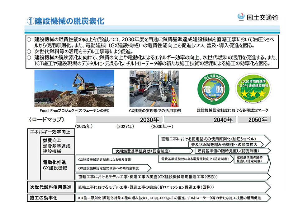 また、欧州・米国・中国では排ガス規制やゼロエミッション建機導入義務化の協議が進行しており、国内でも公共工事でGX建機の導入が推奨されています。